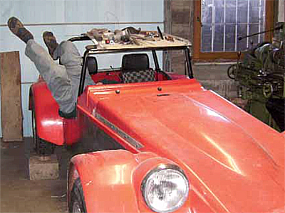 Die Zeit verging! Jörg Eberhard kam ins heiratsfähige Alter und gründete eine Familie. So ganz nebenbei hatte er auch ein Motorrad und baute 1995 einen kernigen Unfall. Erlebnis: Gips am Handgelenk...Erkenntnis: Motorradfahren ist gefährlich.... Ergebnis: Ein vierrädriger offener Untersatz musste her...möglichst ein Roadster. Aber das Traumauto, ein Lotus-Super-Seven war zu teuer. Über ein Oldtimermagazin entstand der Kontakt zum Dutton-Importeur und Kitcar-Händler Kalle Gesthüsten aus Kevelear am Niederrhein. Nicht unwichtig bei der Kaufentscheidung war der Kofferraum, beziehungsweise die mögliche Zuladung des Zweisitzers. Wenigstens ein Kasten Bier sollte Platz haben. (Übrigens, das Bier hat tatsächlich Platz, allerdings ohne Kasten).